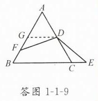 (1)证明:如答图1-1-9,过点D作DG//BC交AB于点G, 因为DG//BC,所以∠ADG = ∠ACB = 60° = ∠A,所以△AGD为等边三角形,所以AG = AD = GD,所以GD = AD = DC. 因为∠GDC = ∠FDE = 120°,所以∠GDF = ∠CDE. 在△DGF和△DCE中,