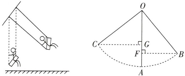 14.(2024 达州期末)如图所示,小丽与爸爸妈妈在公园里荡秋千,小丽坐在秋千的起始位置 A 处,OA 与地面垂直,两脚在地面上用力一蹬,妈妈在距地面 1.2 m 高的 B 处接住她后用力一推,爸爸在 C 处接住她,若妈妈与爸爸到 OA 的水平距离 BF,CG 分别为 1.8 m 和 2.2 m,∠BOC = 90°。