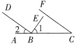 因为 BD⊥BE,所以∠DBE = 90°,所以∠1 + ∠2 = 90°。