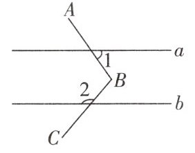 例3 如图所示,已知$a// b$,若$AB$与$BC$的夹角为$105^{\circ}$,$\angle1 = 55^{\circ}$,求$\angle2$的度数。