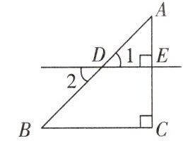 解:(1)当BC,DE被AB所截时,∠B的同位角为∠1;∠B的内错角为∠2;∠B的同旁内角为∠BDE。(2)因为∠C = 90°,DE⊥AC,所以∠AED = ∠C,所以DE//BC,所以∠1 = ∠B。因为∠1 = ∠2,所以∠1 = ∠2 = ∠B。
