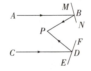 例2 如图所示,某科学兴趣小组发现,将光线$AB$照在平面镜$MN$上会形成反射光线$BP$,且两条光线与$MN$形成的夹角相等,即$\angle MBA=\angle NBP$。将一条平行于$AB$的光线$CD$照在平面镜$EF$上,两条反射光线交于点$P$,若$\angle CDP = 40^{\circ}$,$\angle BPD = 70^{\circ}$,求$AB$与$MN$形成的夹角(锐角)的度数。