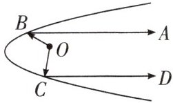 3. 如图所示的是一个探照灯灯碗的纵剖面,从位于$O$点的灯泡发出的两束光线$OB$,$OC$经灯碗反射后平行射出。若$\angle ABO = 30^{\circ}$,$\angle DCO = 80^{\circ}$,则$\angle BOC$的度数为_____。