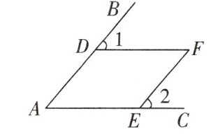 例1 如图所示,$AC// DF$,$AB// EF$,点$D$,$E$分别在$AB$,$AC$上。若$\angle2 = 50^{\circ}$,求$\angle1$的度数。