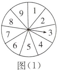 9.(2024 渭南期末)图(1)、图(2)是可以自由转动的两个转盘。图(1)所示的转盘被平均分成 9 份,分别标有 1,2,3,4,5,6,7,8,9 这 9 个数字,转动转盘,当转盘停止后,指针指向的数字即为转出的数字。图(2)所示的转盘被涂上红色与绿色,绿色部分的扇形圆心角是 120°,转动转盘,当转盘停止后,指针指向的颜色即为转出的颜色。小明转动图(1)的转盘,小亮转动图(2)的转盘,若某个转盘的指针恰好指在分界线上时重转。小颖认为:小明转出的数字小于 7 的概率与小亮转出的颜色是红色的概率相同。小颖的观点对吗?为什么?