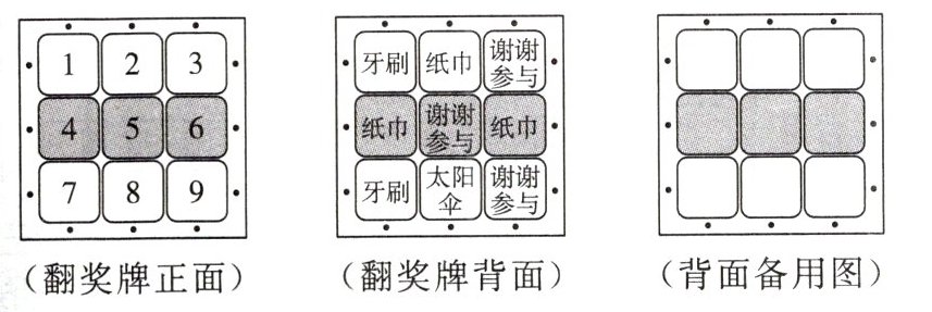 (3) 设计九张翻奖牌中有四张写着太阳伞,其他的五张牌中纸巾两张、牙刷一张、谢谢参与两张。(答案不唯一)