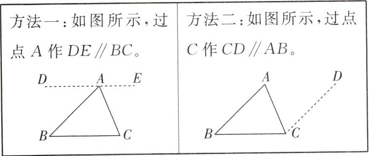 方法一 过点A作DE//BC(如方法一题图),则∠B = ∠DAB,∠C = ∠CAE。