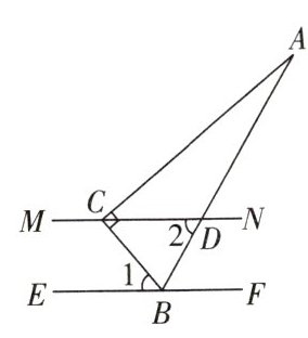 5. 如图所示,直线 MN//EF,Rt△ABC 的直角顶点 C 在直线 MN 上,顶点 B 在直线 EF 上,AB 交 MN 于点 D,∠1 = 50°,∠2 = 60°,求∠A 的度数。
