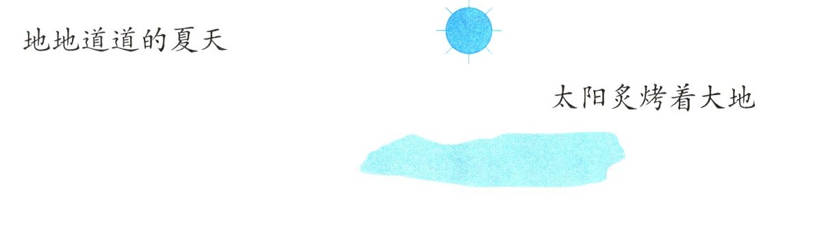 画“____”的句子可以概括为“太阳炙烤着大地”。那其他句子你会怎样概括呢?请照样子,完成这幅“地地道道的夏天”示意图。