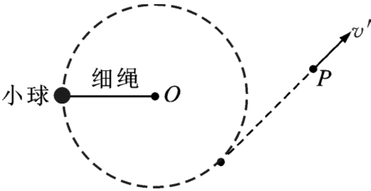 15. 被细绳拴着的小球在光滑水平面绕O点做圆周运动,轨迹如图中虚线所示。不计阻力,某时刻细绳突然断了,小球速度为v,过一段时间小球出现在P点,速度为v'(如图),则v____v'(选填“>”“=”或“<”)。作图找出细绳断时小球的位置,用点在轨迹图上表示。