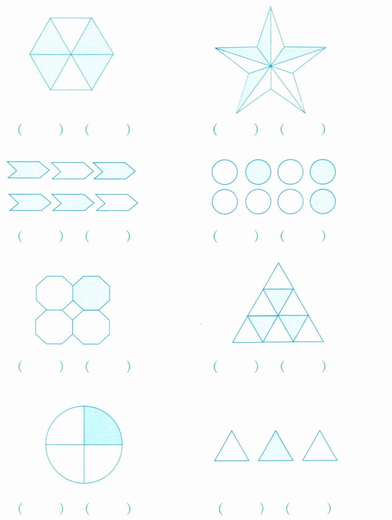 用分数表示下面各图中的阴影部分和空白部分。