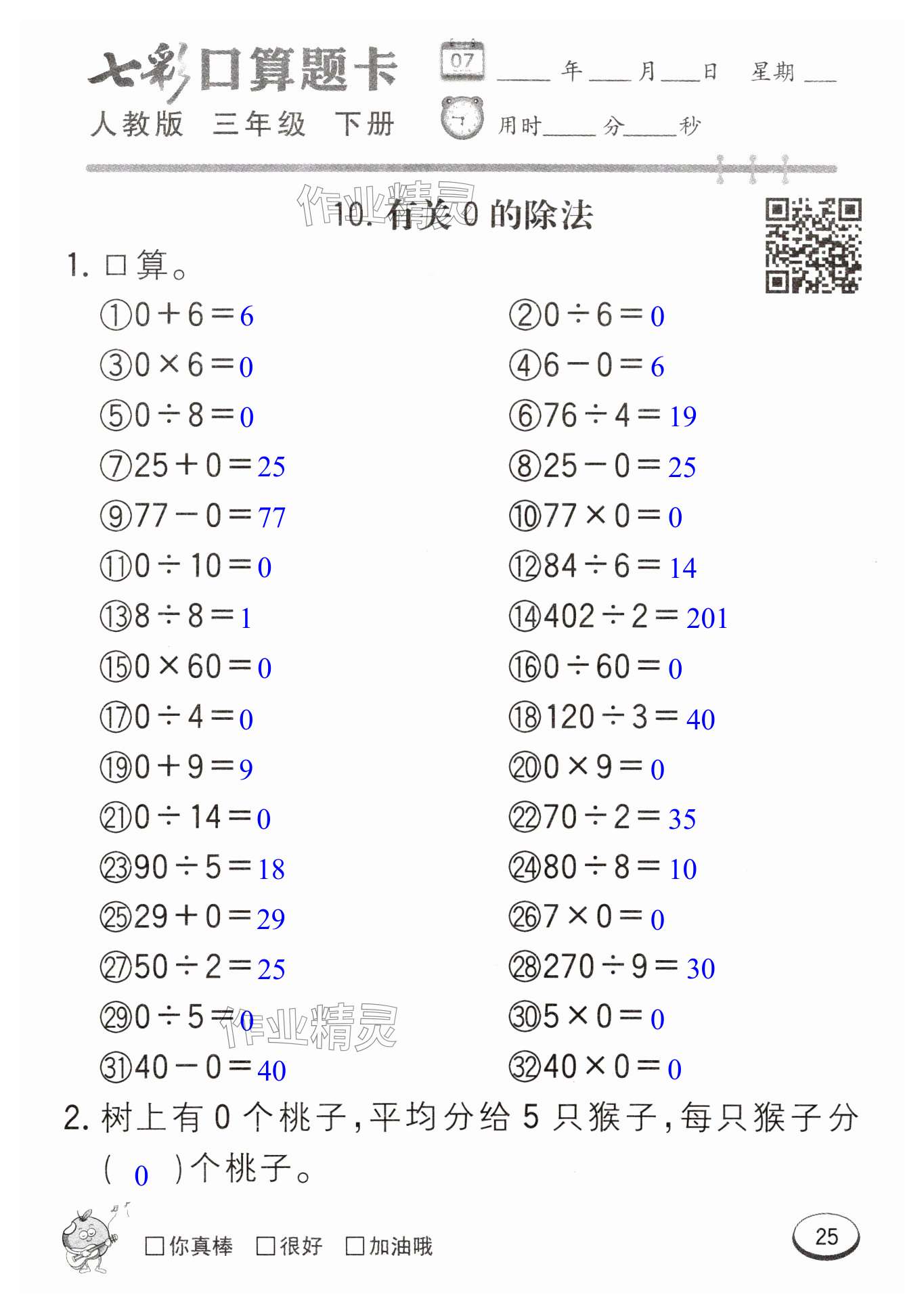 注:目前有些书本章节名称可能整理的还不是很完善,但都是按照顺序排列的,请同学们按照顺序仔细查找。练习册 2025年七彩口算题卡三年级数学下册人教版 答案主要是用来给同学们做完题方便对答案用的,请勿直接抄袭。