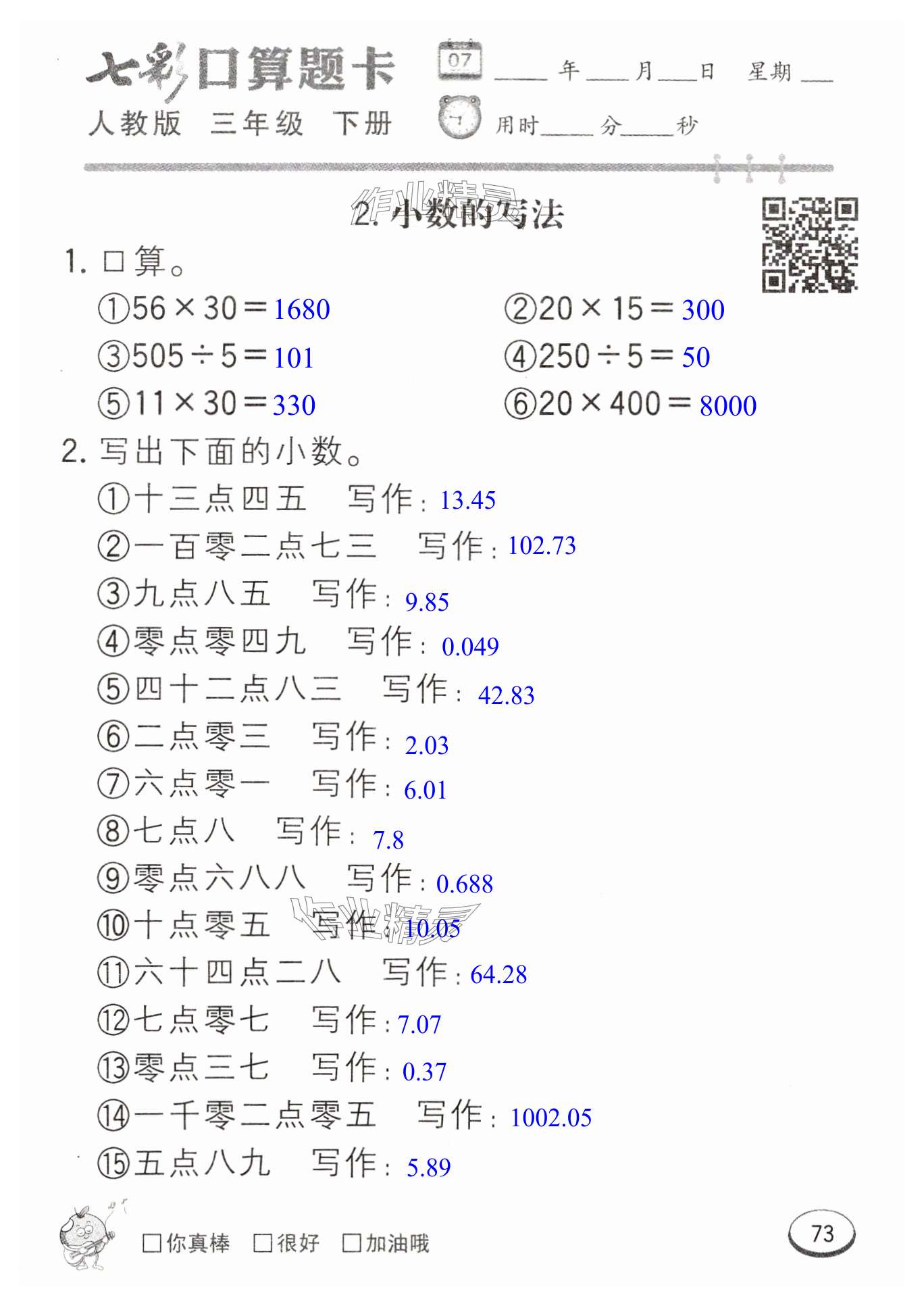 注:目前有些书本章节名称可能整理的还不是很完善,但都是按照顺序排列的,请同学们按照顺序仔细查找。练习册 2025年七彩口算题卡三年级数学下册人教版 答案主要是用来给同学们做完题方便对答案用的,请勿直接抄袭。
