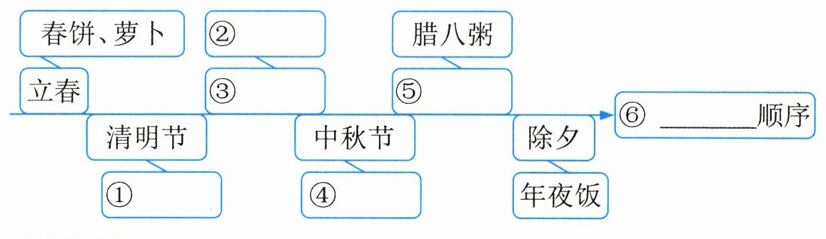1. ①红皮鸡蛋 ②粽子 ③端午节 ④月饼 ⑤腊八节 ⑥时间 2. 对立春、春节的吃食写得较为详细,对清明节、端午节、中秋节、腊八节的吃食写得较为简略。这样写使文章详略得当,主次分明,表现了故乡特有的饮食文化,突出了作者对家乡节日或节气习俗、风土人情的喜爱与怀念之情。 3. 比喻 春饼由白到黄慢慢变熟的样子 4. 神态 比喻 大人们看到年夜饭十分丰盛时的欣慰和看到孩子们衣食无忧的满足 5. A
