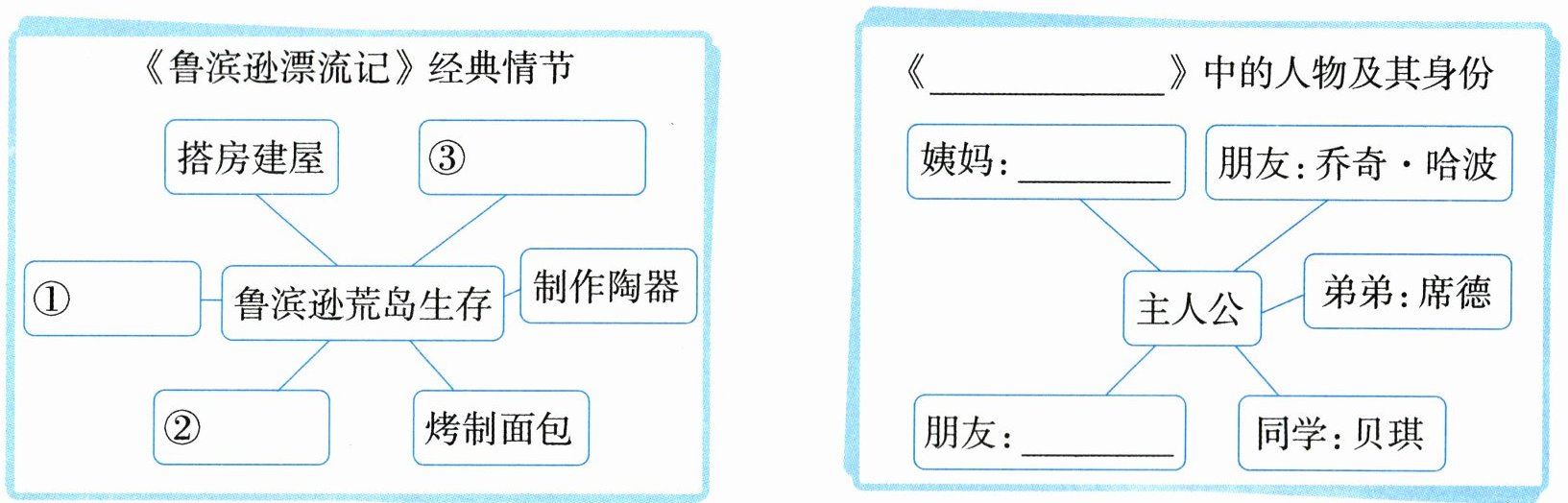 示例:① 驯养山羊 ② 种植粮食 ③ 解救“星期五”@@汤姆·索亚历险记@@波莉@@哈克@@D@@示例:我喜欢和汤姆·索亚交朋友,因为他勇敢正直、敢于冒险,还懂得安慰朋友。他的生活是那样轻松快乐、自由自在,令人向往。