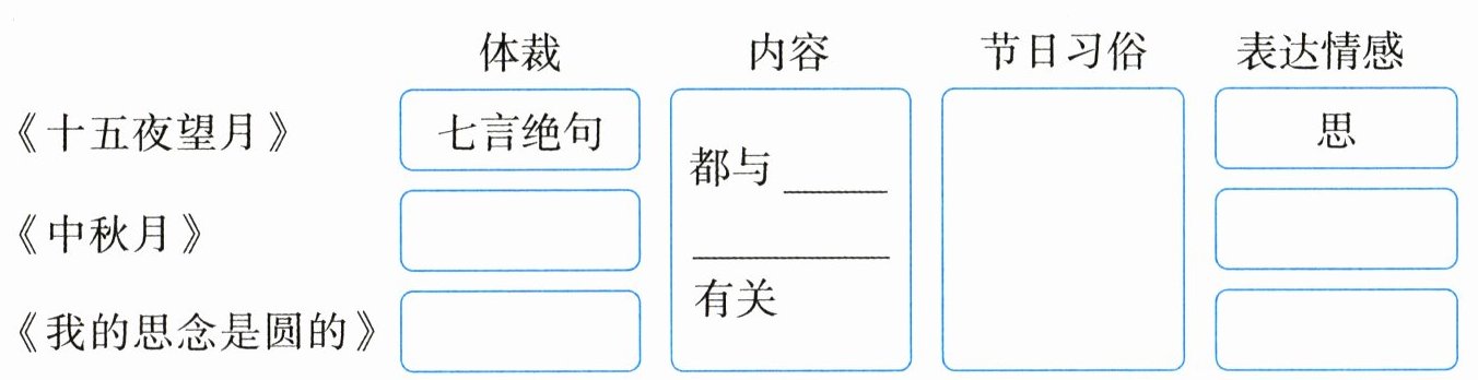 1. 体裁:词 现代诗 内容:中秋节 节日习俗:(示例)吃月饼,赏月 表达情感:喜 苦 2.