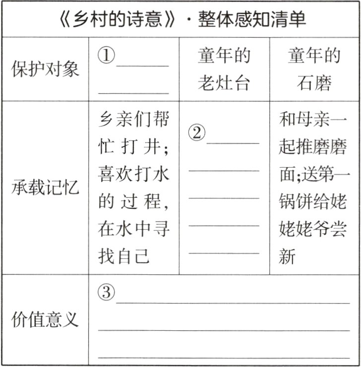 (1)学科素养.思维能力启智小组的同学推荐《乡村的诗意》,并绘制了下面的“整体感知清单”,请你认真阅读选文,帮助他们完善清单中空缺的内容。(6分)(Y8201001)