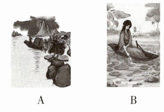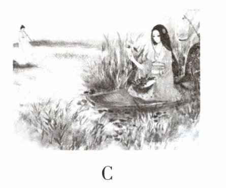 (示例2)B 一位美丽的女子坐在船上,采摘水中的荇菜,身姿优美,又勤劳端庄。与诗中“参差荇菜,左右流(采、芼)之”的内容相符。