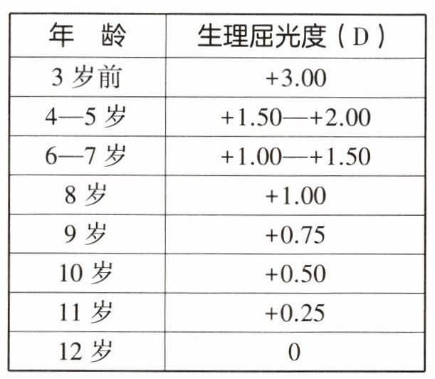 材料三 所谓“屈光”,是光线由一种介质进入另一种不同折射率的介质时,会发生前进方向的改变,在眼光学中即称“屈光”。眼是人体观察客观事物的感觉器官。外界远、近物体发出或反射出来的光线,不论是平行的还是分散的,均需经过眼的屈光系统屈折后,集合结象于视网膜上。不同年龄段生理屈光度参考数值不同,具体如表所示: