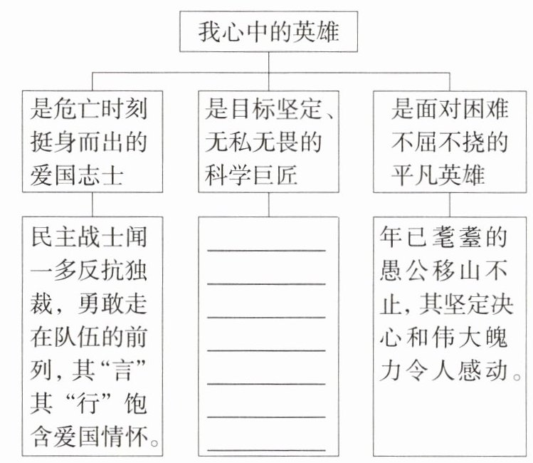 (1)新考法·思维导图 同学们以“我心目中的英雄”为题作主题演讲,小明梳理了教材中出现的英雄人物,计划用来充实演讲素材。请选择一个备选人物完善下面的导图。(Y8204002)