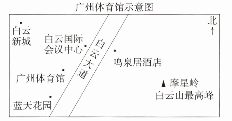 1. 跨地理·相对位置 广州体育馆是为“中国第九届运动会”建设的一座现代化综合性多功能体育设施,是“九运会”体操、篮球等项目的比赛地和盛大的闭幕式举办地。它是广州市新世纪的重点、标志性建筑。下图是广州体育馆示意图,请对它所在位置做一个介绍。