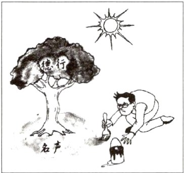 (1)(示例)内容:画面中太阳下有一棵树,树冠上写着“德行”,树影上写着“名声”。树下一个人拿着刷子刷地,努力扩大树影面积。寓意:德行如树,名声如影。德行高尚,名声才能响亮。做人若只想着扩大名声,不重视德行,是舍本逐末。(意对即可)