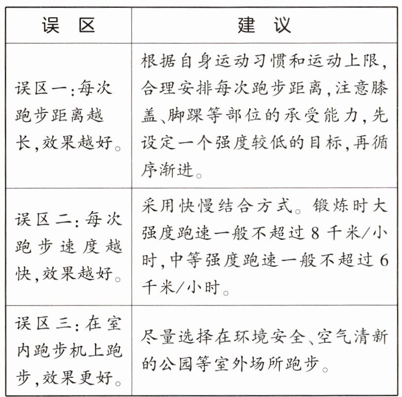 (2)A.根据材料一第1段“晨跑建议在天亮后进行,跑前15分钟,需适当补充糖分”可知,A项正确。B.根据材料一第1段“跑前要做好热身运动,跑后要完成拉伸动作。同时,防寒和防暑也是跑步过程中要注意的”可知,仅做好热身运动并不能完全达到防寒和保障运动安全的目的,还需要注意其他措施,B项错误。C.根据材料二中“误区二:每次跑步速度越快,效果越好”“中等强度跑速一般不超过6千米/小时”可知,这里提及跑步速度是为了强调并非跑步速度越快效果越好,并没有提及速度达到多少会损伤膝盖、脚踝,C项错误。D.根据材料三“这是一种常见的竞赛起跑姿势”可知,下蹲式起跑主要用于竞赛场合,并未说明日常跑步要采用“下蹲式起跑”,而且下蹲式起跑可以让起跑速度更快,并非“跑得更快”,D项错误。