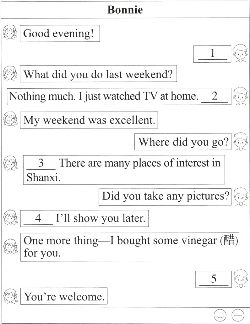 1.Good evening!/Evening!/... 2.How was your weekend? 3.I went to Shanxi./I went to Shanxi with my parents./... 4.Yes./Yes, I did. 5.Thank you!/Thanks!/...