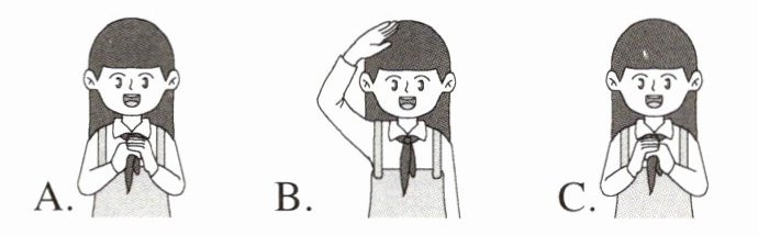 4. C 图片理解题。画线句子意为“对于女性来说,唯一的区别是左手半拳,然后右手握着左手放在胸前”。观察图片可知,句子意思与图片C相符。故选C。