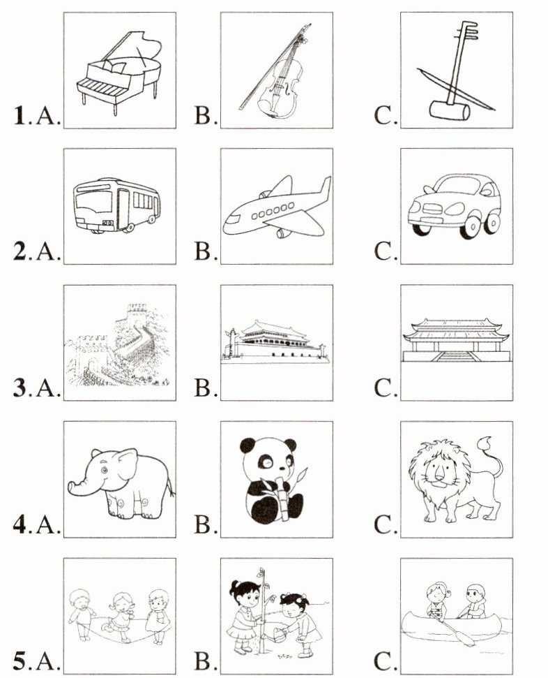 本题共有五个小题,每小题你将听到一组对话。请从每小题所给的A、B、C三幅图片中,选出与你所听到的信息相关联的一项。