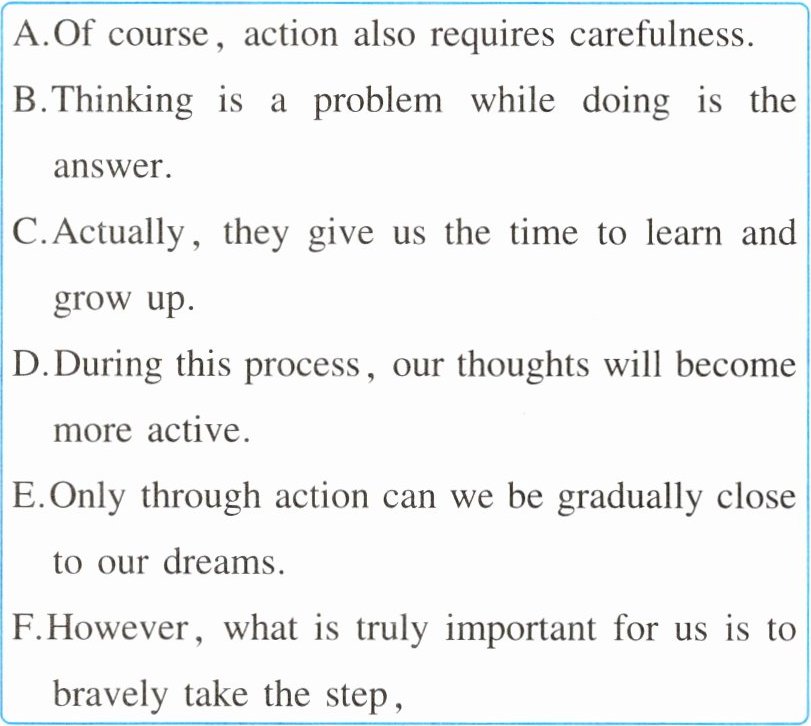 20. E 根据第二段首句“Firstly, action is the key to realizing dreams.”和设空处的位置在本段末尾可知,此处应该和第二段的主旨保持一致,即行动是实现梦想的关键,选项 E“只有通过行动我们才能逐渐接近我们的梦想”符合语境。
