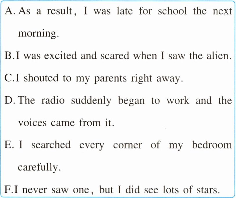 B 19. C 由“Suddenly, I heard strange voices whispering near my bed.”和空后的 We 并结合选项可知,此处指的是我立刻喊我的父母。故选 C。 20. A 由“only remember that none of us could sleep well because of the voices”并结合选项可知,第二天早上我上学迟到了。故选 A。 21. E 由“I decided to find the ‘alien’”并结合选项可知,此处是指作者仔细地在房间的角落寻找。故选 E。 22. D 由“However, it wasn't the alien that I expected, but an old broken radio in my bookcase.”并结合选项可知,此处指的是声音是从收音机传出来的。故选 D。 23. F 由“Almost every night, I would look out of my bedroom's window and search the sky for UFOs.”并结合选项可知,此处指的是我从来没有见过不明飞行物,但是我看到了很多星星。故选 F。