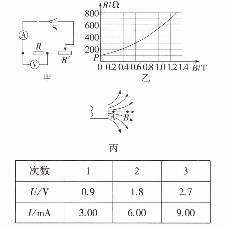 解析 (1)由题图乙可以看出,图像中P点表示的物理意义是磁感应强度为0时,磁敏电阻R的阻值是100Ω;(2)磁敏电阻的测量值$R = \frac{U}{I}=\frac{0.9V}{0.003A}=300Ω$,由图像可知,此时磁感应强度为0.6T;(3)将磁敏电阻由A处移到B处时,磁感线变得稀疏,说明磁感应强度变小,则由图乙可知磁敏电阻的阻值变小,电路中总电阻变小,电路中电流增大,其他条件不变,滑动变阻器分得的电压增大,电源电压不变,则磁敏电阻两端的电压减小,即电压表的示数减小;(4)可以考虑磁场的一些性质,提出问题,如磁敏电阻的阻值与磁场方向有关吗?