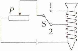 A:滑片P向右移动时,变阻器接入电路中的电阻增大,电路中电流减小,则电磁铁的磁性会减弱,A正确;滑片P向左移动,变阻器接入电路中的电阻减小,电路中电流增大,则电磁铁的磁性会增强,B错误;开关S由2扳到1时,线圈的匝数增加,则电磁铁的磁性会增强,C错误;仅将电源的正负极对调,会改变电流的方向,只能改变电磁铁的磁极,对电磁铁的磁性强弱不会有影响,D错误。