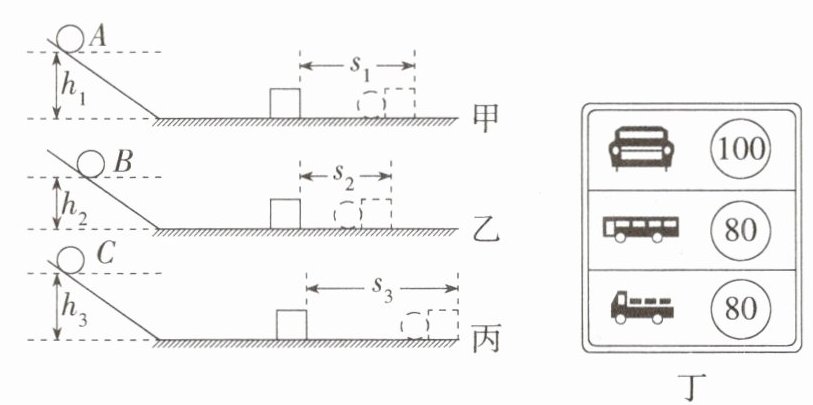 解析:(1)小钢球在滚下斜面的过程中,高度变小,重力势能变小,它的重力势能转化为动能,该实验是通过观察小木块向前移动距离的大小来比较小钢球动能的大小,这样的研究方法叫作转换法;(2)小钢球在水平面上不能立即停下,是因为小钢球具有惯性,小木块最终会停下来是因为受到阻力的作用;(3)分析比较甲和乙两组实验可得,甲中小钢球初始位置的高度大,运动到水平面的速度大,小钢球的动能大,故得出:物体质量相同时,速度越大,动能越大;(4)研究动能与质量的关系要控制速度相同,故要小钢球从斜面的相同高度由静止下滑,故分析比较甲、丙两组实验可得出物体的动能与质量的关系;(5)图丁所示的交通标志牌是交通管理部门对不同车型设定的最高速度,质量越大的车,限速越低。