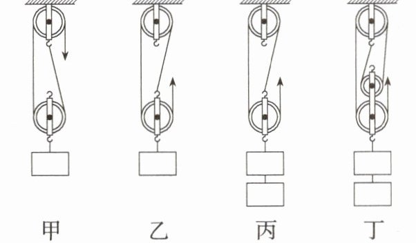 解析:(1)实验中要竖直向上匀速拉动弹簧测力计,使物体匀速升高,此时系统处于平衡状态,测力计示数才等于拉力大小;某同学在该实验中加速向上提升重物,提升物体的力变大,总功变大,而有用功不变,故滑轮组的机械效率变小;(2)第1次实验,$h_{1}=0.1m$,$s_{1}=0.2m$,可知由2段绳子承担物重;第2次实验,$h_{2}=0.1m$,$s_{2}=0.3m$,可知由3段绳子承担物重;第3次实验,$h_{3}=0.1m$,$s_{3}=0.3m$,可知由3段绳子承担物重;比较1、2两次的实验数据,同一滑轮组,绳子段数不同,机械效率相同,可得出结论:使用同一滑轮组提升同一重物时,滑轮组的机械效率与绳子段数无关;比较2、3两次的实验数据,同一滑轮组提升不同重物,物重不同,机械效率不同,可得出结论:同一滑轮组,物重越大,滑轮组的机械效率越高;(3)由图丁可知绳子的有效段数为4,绳端移动距离:$s_{4}=4h_{4}=4\times0.1m = 0.4m$;比较3、4两次的实验数据,不同滑轮组提升相同重物,动滑轮重不同,机械效率不同,可得出结论:不同滑轮组提升相同重物时,动滑轮越重,滑轮组的机械效率越低。