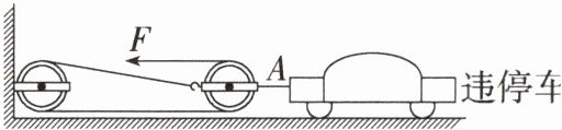 因为地面与违停车的摩擦力为车重的$0.1$倍,所以汽车受到的摩擦力:$f = 0.1G = 0.1×1.5×10^{4}\ N = 1.5×10^{3}\ N$。因为汽车做匀速直线运动,所以钢绳$A$受到的拉力:$F_{A}=f = 1.5×10^{3}\ N$;