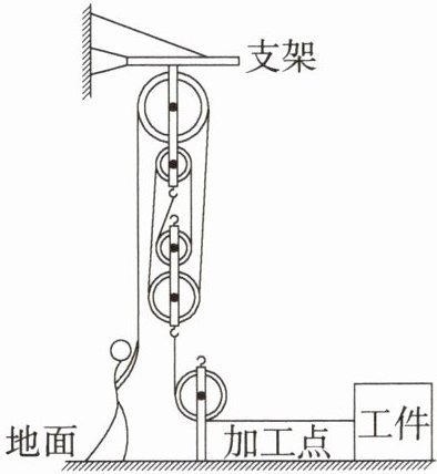 2.(2023 四川广元中考)如图所示,某工人利用滑轮组将一个工件沿水平地面匀速拉动到加工点。拉动过程中,工人对绳的拉力始终沿竖直方向,工人双脚始终与水平地面接触且接触面积为 300 cm²。工人对地面的压强为 2.0×10⁴ Pa;此工人的质量为 70 kg,两个动滑轮的质量共为 10 kg,绳重、绳与滑轮之间的摩擦均忽略不计,g 取 10 N/kg。求: