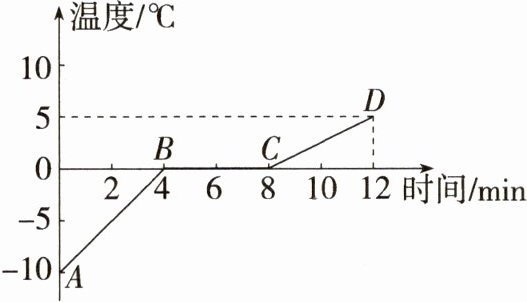8.(2024广东佛山文翰中学期中,12,★)如图所示是小明同学在一标准大气压下探究冰熔化时温度随时间变化的图像,第5min时的内能_______第7min时的内能(选填“大于”“等于”或“小于”);物质在CD段的比热容______在AB段的比热容(选填“大于”“等于”或“小于”),若在8~12min内物质吸收了6300J的热量,则实验中水的质量是_______kg。[已知$c_{水}=4.2×10^{3}\text{ J}/(\text{kg}\cdot^{\circ}\text{C})$]