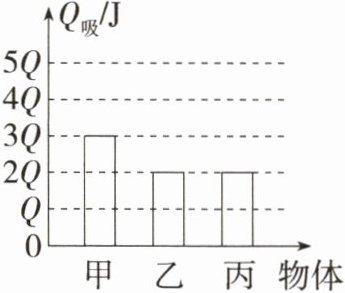 1.(2024广东佛山顺德四校联考)甲、乙两物体质量都为2kg,丙物体质量为1kg,三个物体温度都升高1℃,吸收热量$Q_{吸}$如图所示,以下说法正确的是 ( )