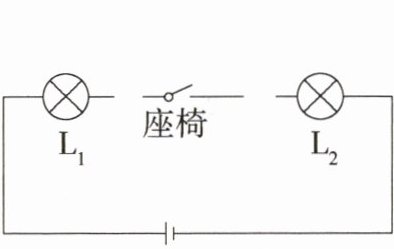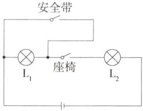 解析:由题意知,当座椅开关闭合时,红灯 L₁、绿灯 L₂ 都发光,说明开关、L₁、L₂ 串联;将安全带插头插入插口时,红灯 L₁ 熄灭,绿灯 L₂ 仍发光,说明红灯 L₁ 被开关短路了。据此连接电路图。