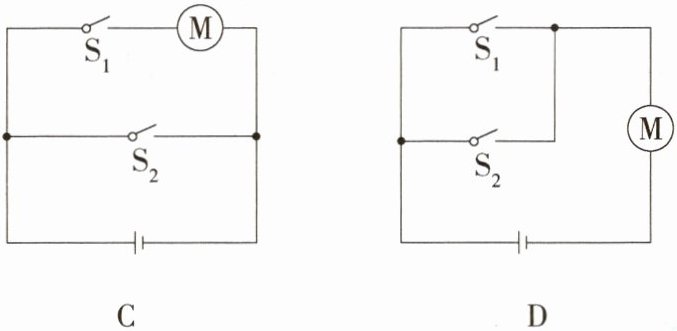 7.(2023四川自贡中考,15,)在富顺高铁站的自动检票闸机口,乘客需刷身份证,同时进行人脸识别,两个信息都符合后闸机门(电动机)才自动打开,检票通过。身份证和人脸识别系统都相当于开关,信息符合后开关自动闭合。下列电路中,符合上述要求的是 ( )