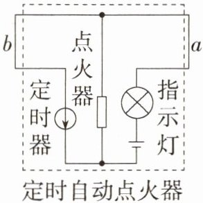 解析:由题知,断开开关 S,指示灯熄灭,整个装置停止工作,所以,该开关应与指示灯串联在干路中;由电路图可知,开关 S 应安装在 a 处。由电路图可知,定时器与点火器并联;点燃烟花前,只有定时器是通路(相当于一根导线)时,才能将点火器短路,使点火器不能工作;否则点火器工作会点燃烟花造成人员伤害。