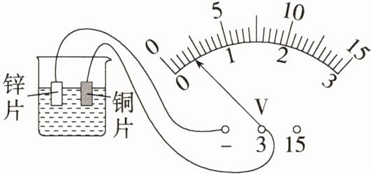 9.(2024广东惠州二中期中,5,★☆☆)如图所示,在烧杯中加入盐水,然后将连在电压表上的铜片和锌片插入盐水中,这样就制成了一个盐水电池。观察电压表的接线和指针偏转,下列说法正确的是(P9303001) ( )