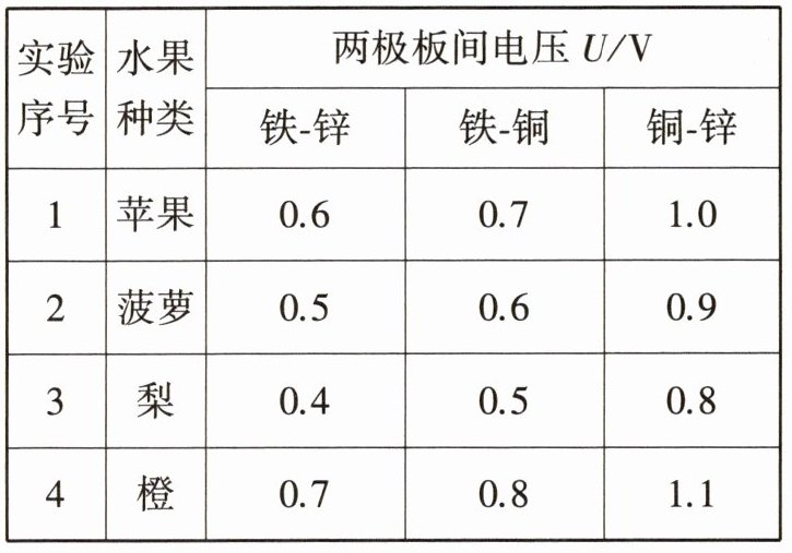 ②分析数据可知,水果电池电压与极板材料有关,表中效果最好的两个极板材料是__________。