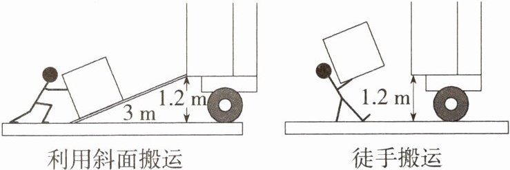 11.跨学科·物理学与日常生活(2023江西中考,16,★☆☆)如图所示,利用斜面将箱子推进车厢,通常要比把箱子直接从地面搬进车厢省力多了。某同学用100 N的力沿斜面向上匀速推动箱子,已知箱子质量为20 kg,斜面长3 m,斜面高1.2 m,g = 10 N/kg。求:(P9303004)