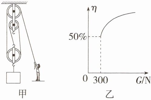 (2) 由图乙可知,物重$G = 300\ N$时,滑轮组的机械效率$\eta = 50\%$。因机械中摩擦力及绳重忽略不计,所以,克服动滑轮重力做的功为额外功。滑轮组的机械效率$\eta=\frac{W_{有}}{W_{总}}×100\%=\frac{Gh}{Fs}×100\%=\frac{G}{nF}×100\%=\frac{G}{G + G_{动}}×100\%=\frac{300\ N}{300\ N + G_{动}}×100\% = 50\%$,解得:$G_{动}=300\ N$;