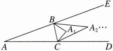 12. 如图,在△ABC中,∠A = 20°,∠EBC,∠DCB为△ABC的外角,∠EBC与∠DCB的平分线交于点A_{1},∠EBA_{1}与∠DCA_{1}的平分线交于点A_{2},…,∠EBA_{n - 1}与∠DCA_{n - 1}的平分线相交于点A_{n},当两条角平分线无交点时,则n的值为________.