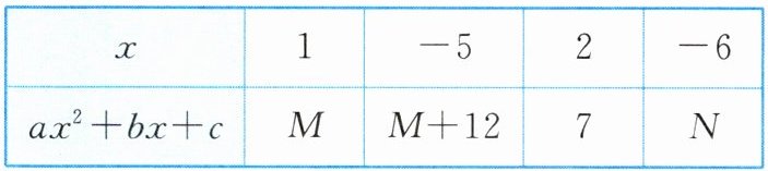 23 [点拨]当 $x = 1$ 时,$a + b + c = M$,① 当 $x = 2$ 时,$4a + 2b + c = 7$,② 当 $x = - 5$ 时,$25a - 5b + c = M + 12$,③ 当 $x = - 6$ 时,$36a - 6b + c = N$,④ 由③ - ①,得 $24a - 6b = 12$,即 $4a - b = 2$,由④ - ②,得 $32a - 8b = N - 7$,所以 $8(4a - b)=N - 7$. 所以 $N - 7 = 16$,解得 $N = 23$.