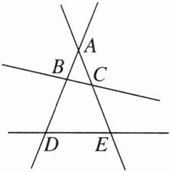 7. 如图,直线AD与AE相交于点A,直线BC分别交AD,AE于点B,C,直线DE分别交AD,AE于点D,E,分别写出图中的两对同位角、两对同旁内角.